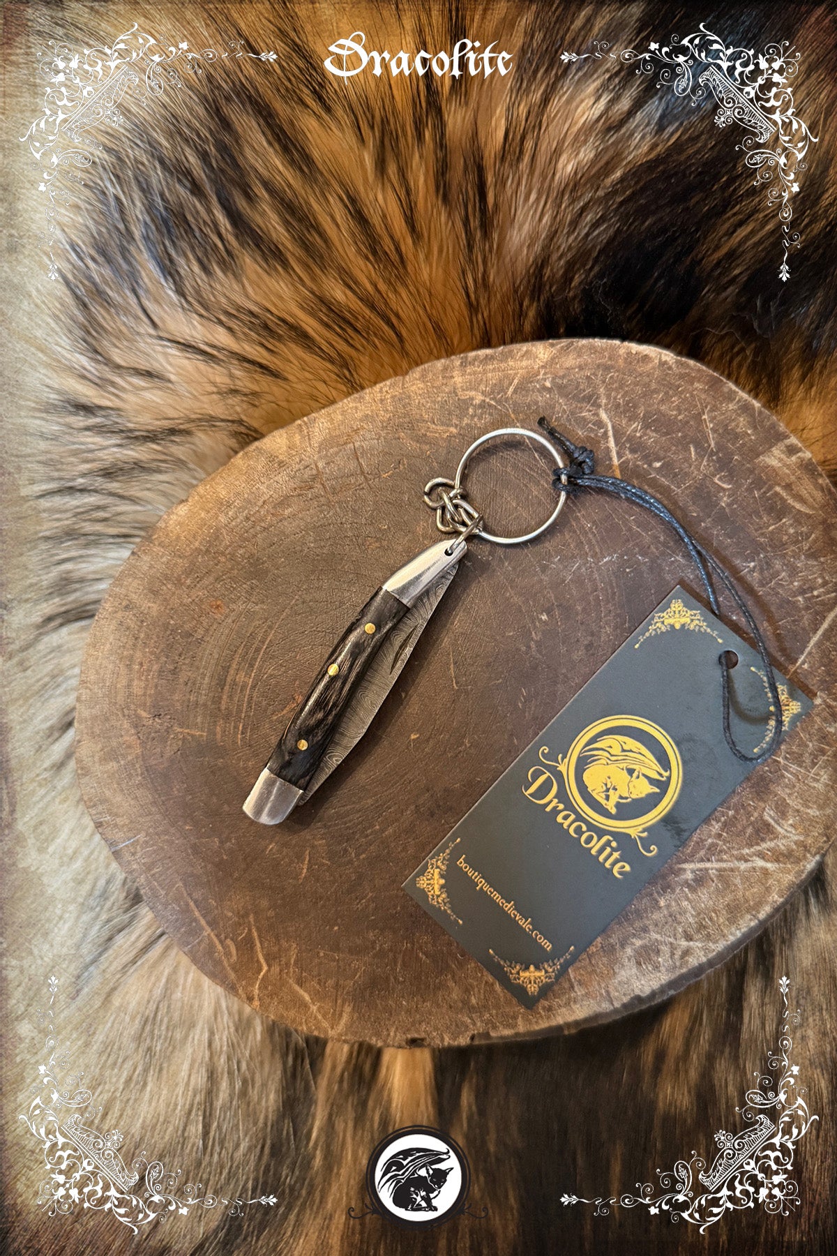 Apportez une touche médiévale authentique à vos clés avec ce porte-clés mini couteau pliant. Compact et raffiné, il arbore une lame damassée unique et un manche sombre orné de rivets dorés, évoquant les couteaux de chasse traditionnels.