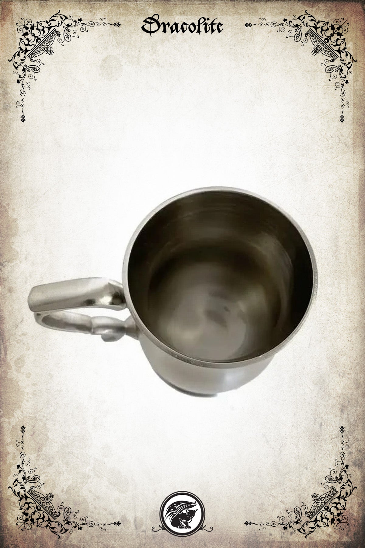 This small antique reproduction colonial-style mug is made of tin-plated brass, is food-safe, and holds 10 oz of liquid. It makes a great addition to a Colonial or Early American setting, or a theatrical prop.