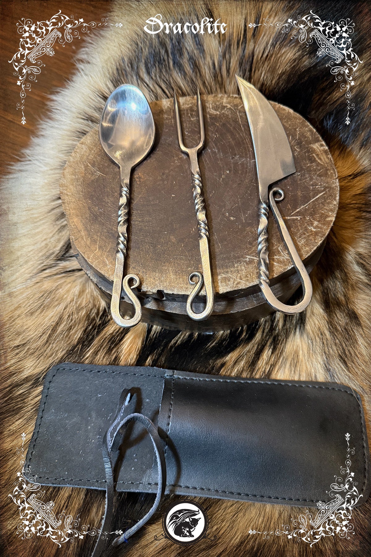 Ensemble d’ustensiles médiévaux forgés – couteau, fourchette, cuillère & étui en cuir